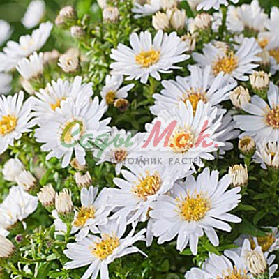 Астра бокоцветная Принц/Prince имеет пурпурно- окрашенную листву.Язычковые цветки белые до 1,5 см в диаметре, диск пурпурный.