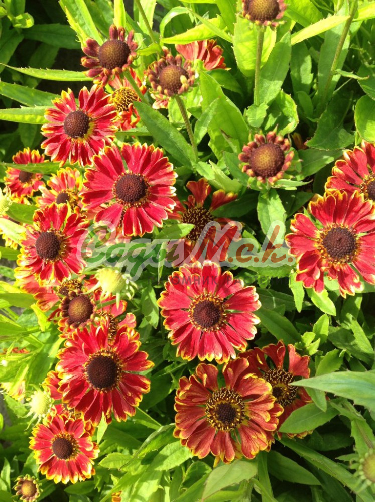 Эффектное растение из семейства Астровые, высотой до 120 см. Образует мощный ветвистый куст с ланцетными листьями, усыпанный соцветиями (4-6 см) в желто-красно-коричневых тонах. Гелениум относится к группе поздноцветущих многолетников и благодаря своим солнечным краскам гармонирует с окружающим осенним пейзажем. Предпочитает светлые или полутенистые места с плодородными влажными почвами. Семена высевают в открытый грунт осенью или в ящики весной и проращивают на свету при температуре 18-22°C, 14-20 дней. Сеянцы пикируют в фазе двух-трех настоящих листьев, на постоянное место высаживают в начале июня. В сухую жаркую погоду растения нуждаются в обильном поливе. Гелениум отлично смотрится на заднем плане больших цветников, около декоративных кустарников, группами или одиночно. Прекрасно сочетается с многолетними астрами. Подходит для срезки.