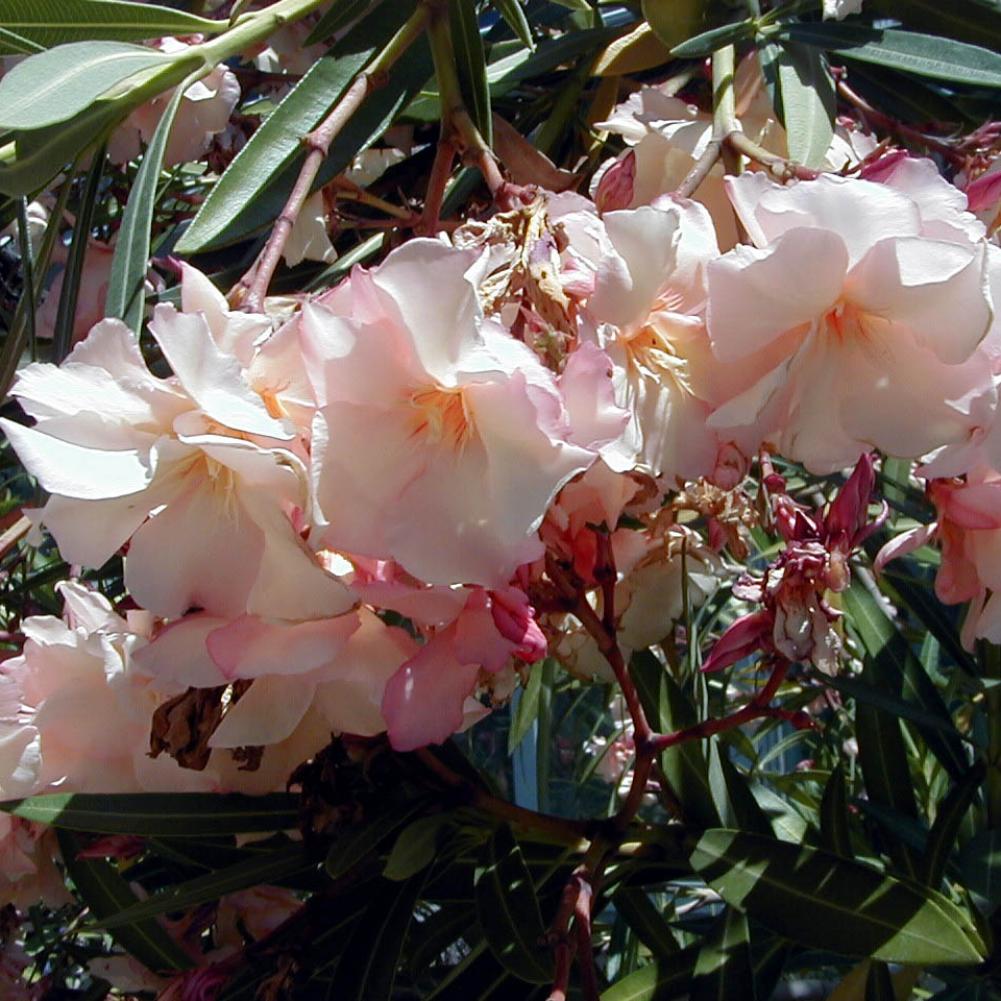 Олеандр обыкновенный Прованс (лат. Nerium oleander Provence) - большой куст с ветвящимися бурыми стеблями. Листья зеленые, очень темные со светлой жилкой. Цветки очень нежные, светлые, бело-кремово-розовые с оранжевым центром, махровые и душистые. Цветение длится с начала лета до середины осени. Внимание! Олеандр - ядовитое растение, поэтому при его культивировании требуется осторожность.