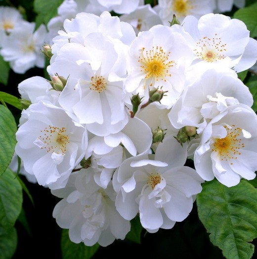 Роза Bobbie James - один из лучших мелкоцветковых рамблеров, который напоминает видовые розы, но имеет более крупные и более махровые цветки, по форме напоминающие цветки вишни. Аккуратные полумахровые цветки 4,5 см в диаметре появляются в крупных густых щитковидных соцветиях по 5-15 штук из заостренных, зеленоватых с оттенком розового бутонов. В центре цветка расположен пучок золотых тычинок, цветки сильно пахнут мускусом. Куст очень сильнорослый, высотой от 3 до 7 м, обильно укрыт крупной ярко-зеленой блестящей листвой.