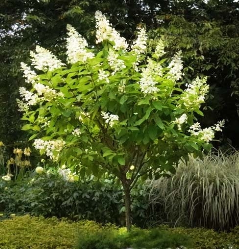 Цветы душистые белые махровые, 2-3см в диаметре, собраны в плотные пирамидальные соцветия, из 2-3 метелок, около 25см длиной. Цветет в июне. Листья сердцевидные, светло-зеленые. Любит солнце.