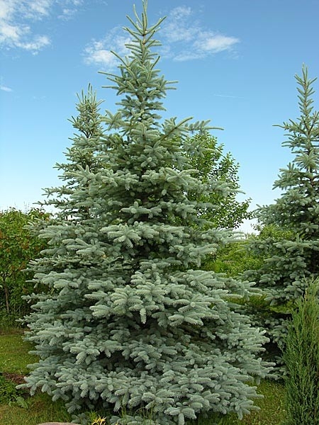 Дерево высокорослое, достигает 15 м в высоту и около 8 м в ширину. Обладает ионизирующими воздух свойствами. Ежегодный прирост составляет 15 см в ширину и до 30 см в высоту. Крупномер колючая Glauca покрыт серебристо-голубой, жесткой хвоей (около 2,5 см). Ель ценится благодаря необычной окраске и красивой форме кроны. Может использоваться в одиночных посадках, для формирования живой изгороди. Саженцы светолюбивы, морозостойкие, не требовательны к почве, но любят обильный полив.